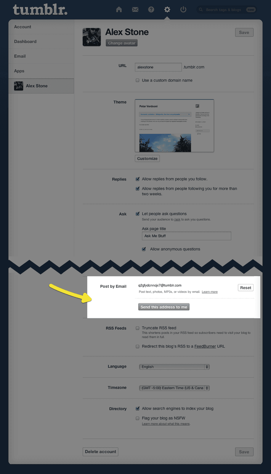- 페이지 중앙 부분에 Post by Email 에서 자신의 텀블러 고유 이메일 주소 (예시) jipwkf834@tumblr.com 를 확인할 수 있다.