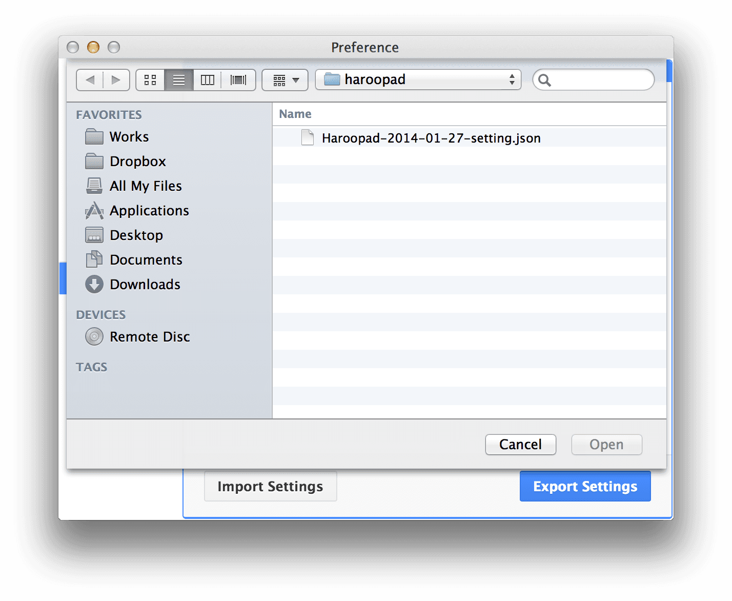 파일명은 기본적으로 Haroopad-YYYY-MM-DD-setting.json 규칙으로 저장됩니다.