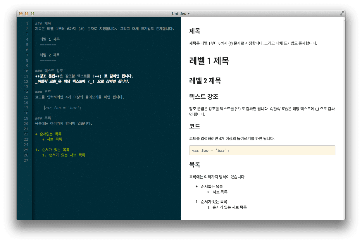 위의 예제를 마크다운 문서를 뷰어로 보면 우측과 같이 사용자가 문서를 읽기에 훨씬 나은 방식으로 표현된다.