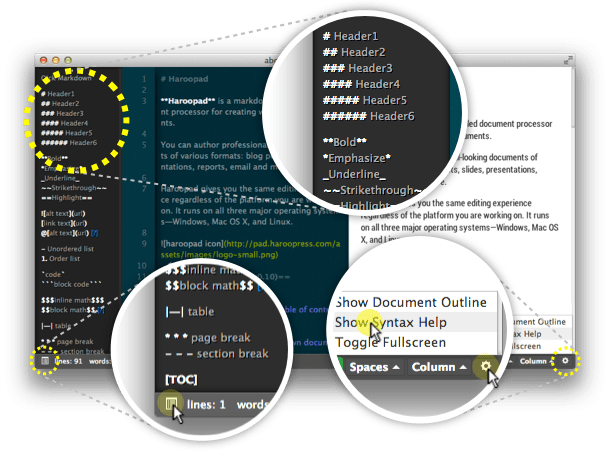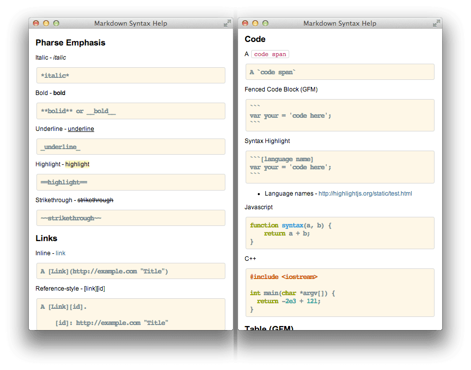 상단 메뉴중 도움말(Help) > 마크다운 구문 도움말을 클릭하면 새로운 윈도우에 구문 도움말이 좀더 상세하게 표시됩니다.